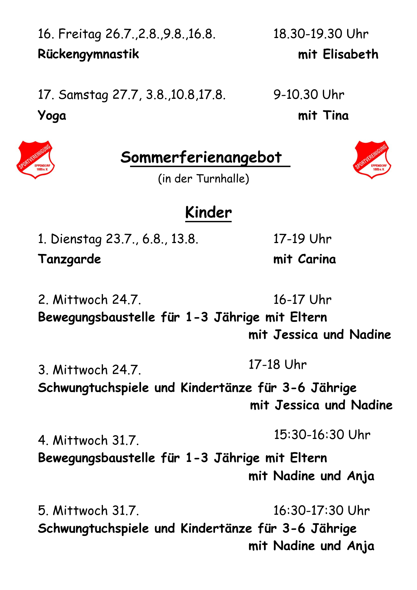 Auch in den diesjährigen Sommerferien bietet die Sportvereinigung für ihre Mitglieder Sommerkurse an, bei denen du dich auspowern kannst.